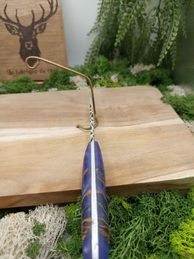 Le manche est en résine époxy avec inclusion de pomme de pin, donnant un rendu original et naturel à chaque pièce. Chaque couteau devient ainsi unique, avec un mélange de transparence et de bois encapsulé, apportant charme et personnalité à l’outil.