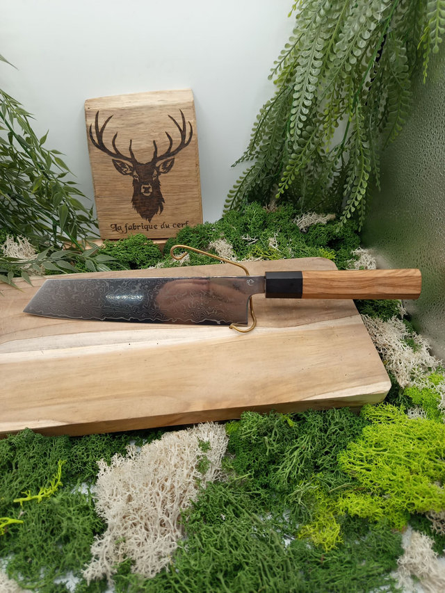 Découvrez le couteau japonais “Santoku”, conçu pour les amateurs de cuisine exigeants. Sa lame en acier damas AUS10 de 21 cm offre un tranchant précis et durable, idéal pour découper, trancher et hacher avec fluidité. Le damas ajoute des motifs uniques qui rendent chaque couteau unique.