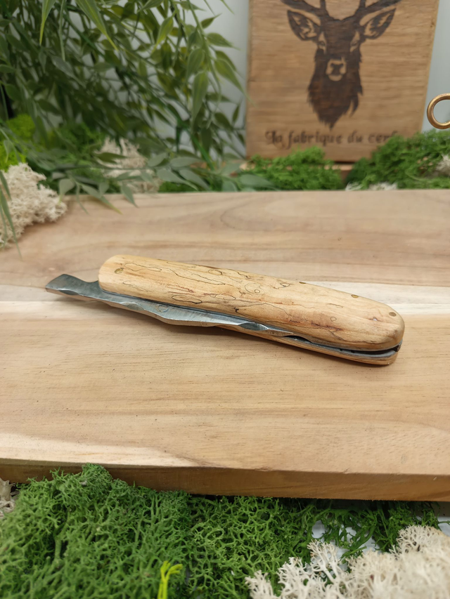 Couteau pliant artisanal “Le Cerf” – friction – lame acier inox Z40C13 – manche érable du Japon